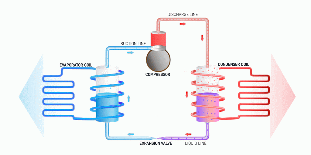 The refrigerant is then sent via the copper pipes back into the compressor which is basically an electrical pump that is compressing the refrigerant which is now in a gas state backing to a liquid state. Is basically squeezing the gas to become a liquid. This is also increasing the temperature of the refrigerant. Any refrigerant has a corresponding temperature for any pressure level. So when the pressure is high the temperature is high as well. Moving on from the compressor the refrigerant enters the condenser which is there part with a big fan in the outdoor unit. Here, a part of its temperature it’s taken away but the pressure stays almost the same. Therefore, the refrigerant is now no longer in balance it’s having the pressure but it doesn’t have the temperature. It’s eager to get back the energy lost. The refrigerant is then forced into an expansion valve that drops its pressure.